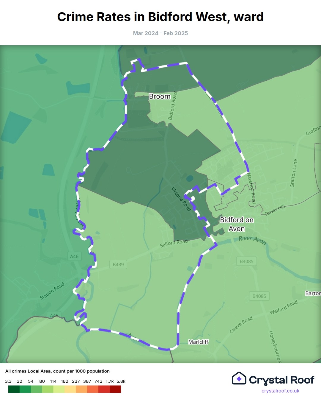 Bidford West, (ward) includes areas with the following crime ratings (see map):