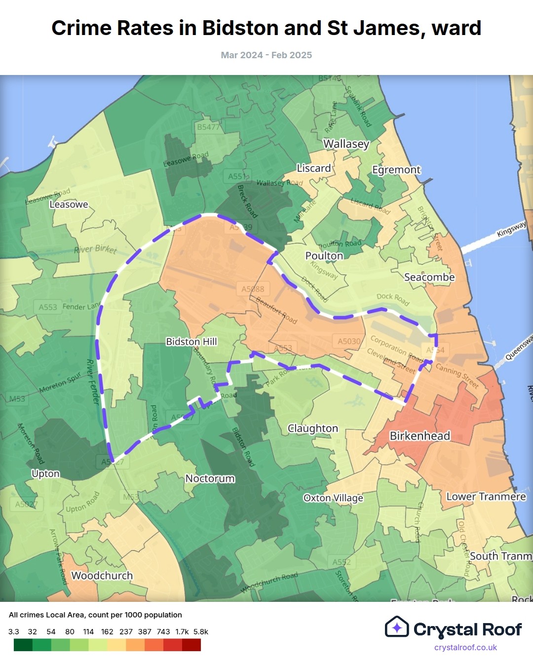 Bidston and St James, (ward) includes areas with the following crime ratings (see map):