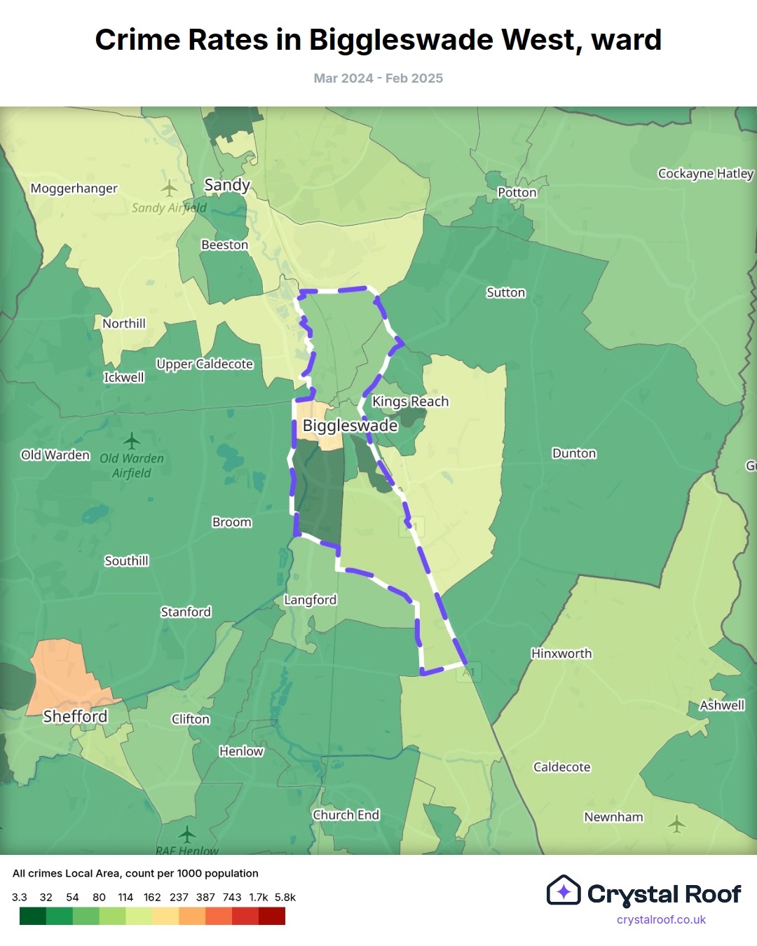Biggleswade West, (ward) includes areas with the following crime ratings (see map):