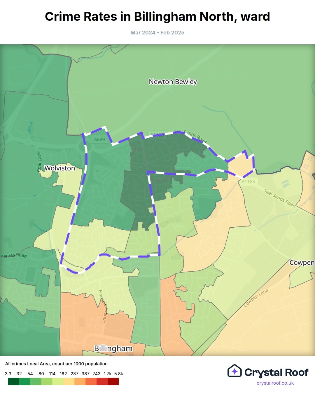 Billingham North, (ward) includes areas with the following crime ratings (see map):