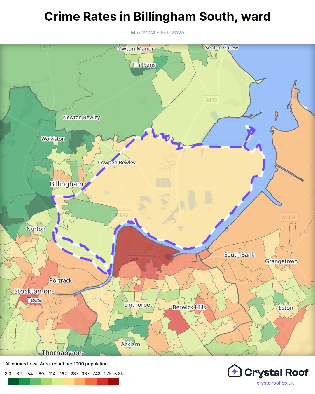 Billingham South, (ward) includes areas with the following crime ratings (see map):