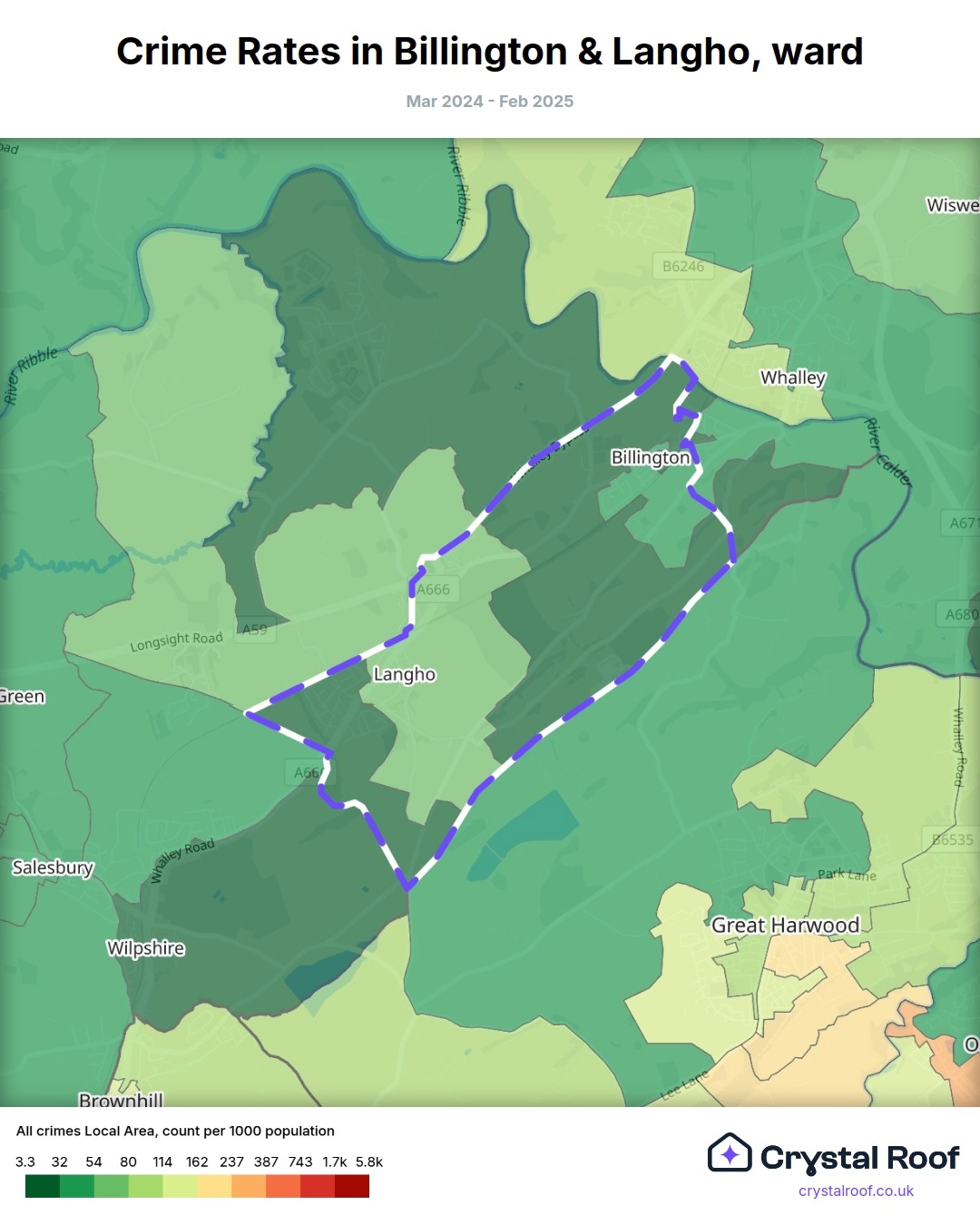 Billington & Langho, (ward) includes areas with the following crime ratings (see map):