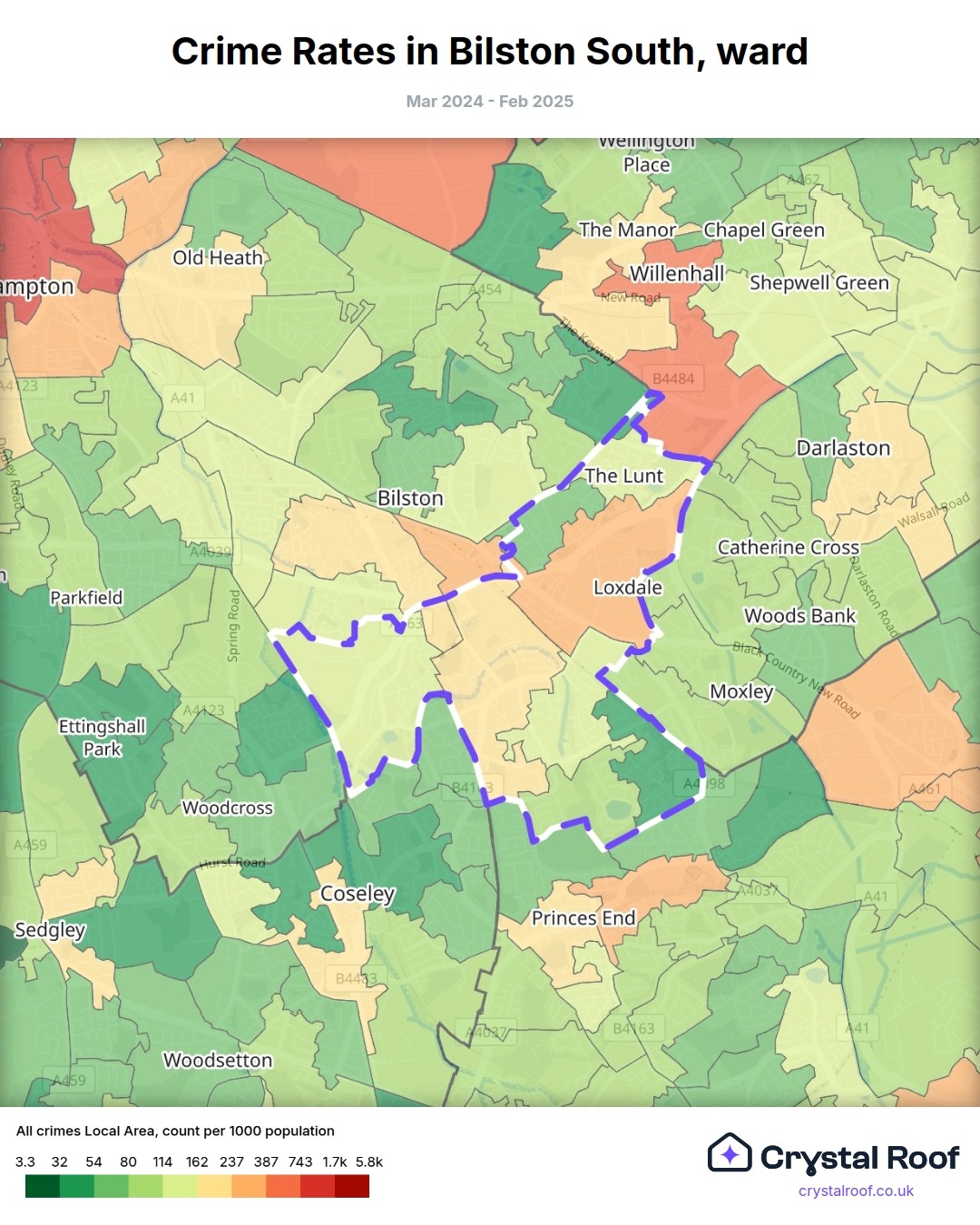 Bilston South, (ward) includes areas with the following crime ratings (see map):