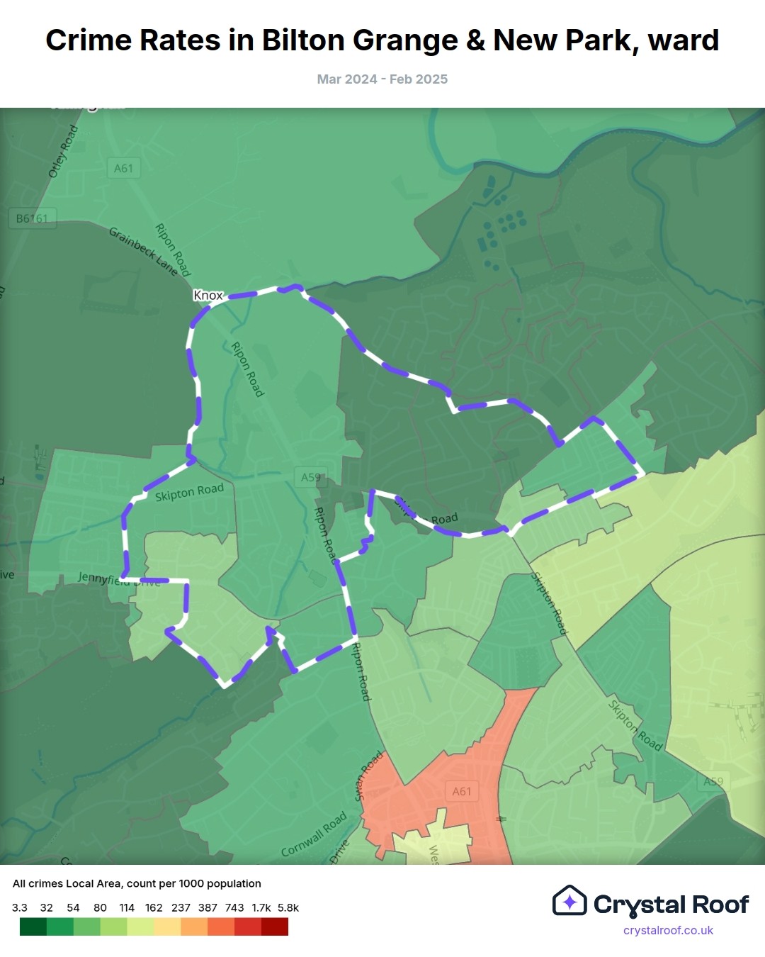The figures in grey indicate the relative ratings of Bilton Grange & New Park (ward) for a specific crime type compared to other wards in England and Wales.