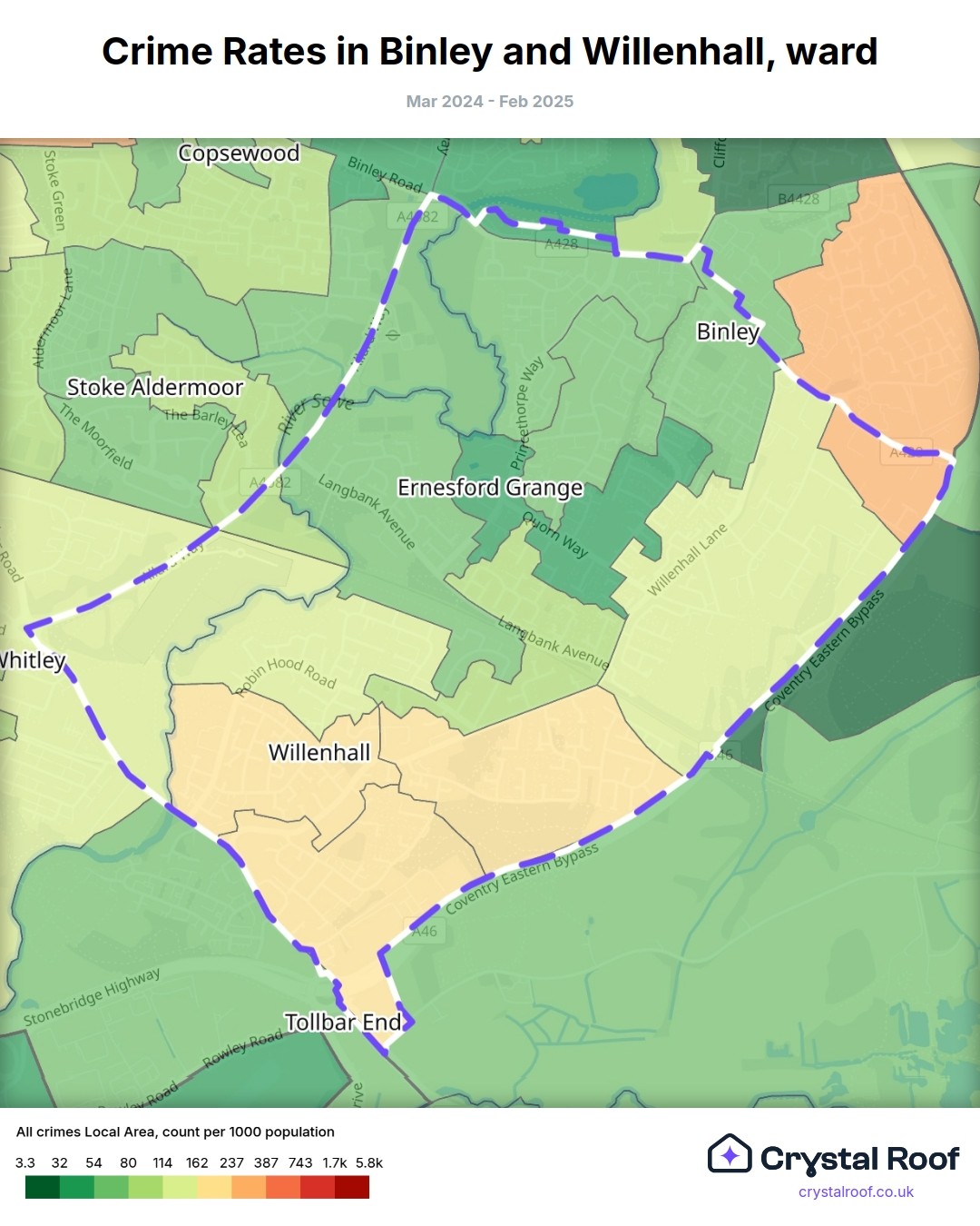 Binley and Willenhall, (ward) includes areas with the following crime ratings (see map):