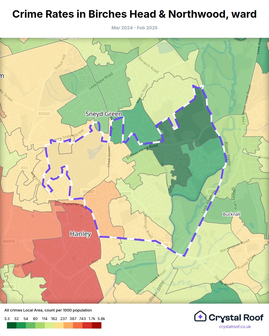 Birches Head & Northwood, (ward) includes areas with the following crime ratings (see map):