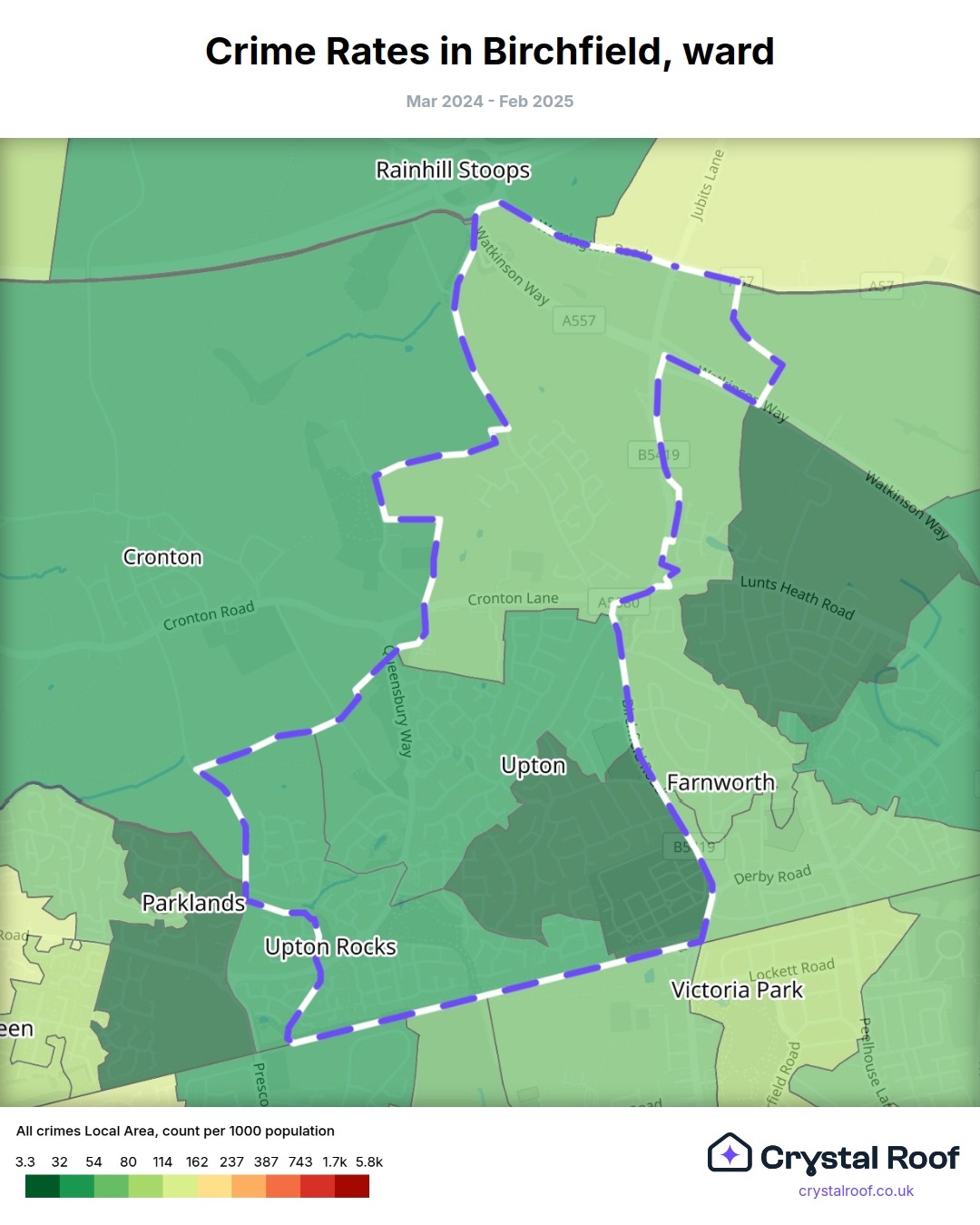 Birchfield (ward) is located within Halton (borough). Annual total crime rate in Halton (borough) is 91.4 crimes per thousand resident population, which can be rated as 4 out of 10 or low crime level compared to other local authority districts in England and Wales.