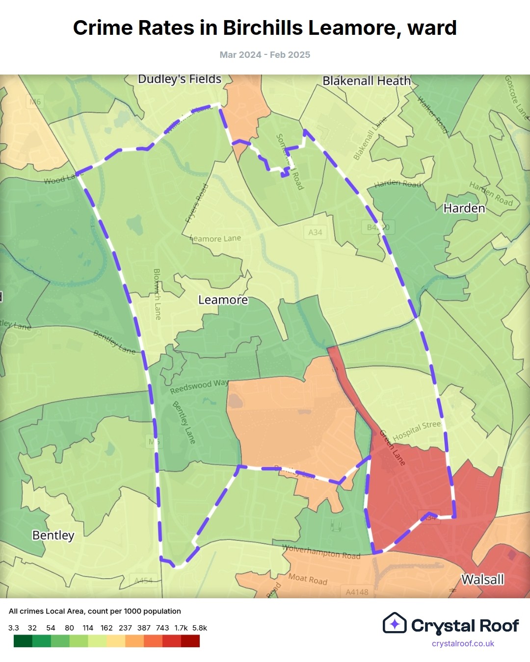 The figures in grey indicate the relative ratings of Birchills Leamore (ward) for a specific crime type compared to other wards in England and Wales.