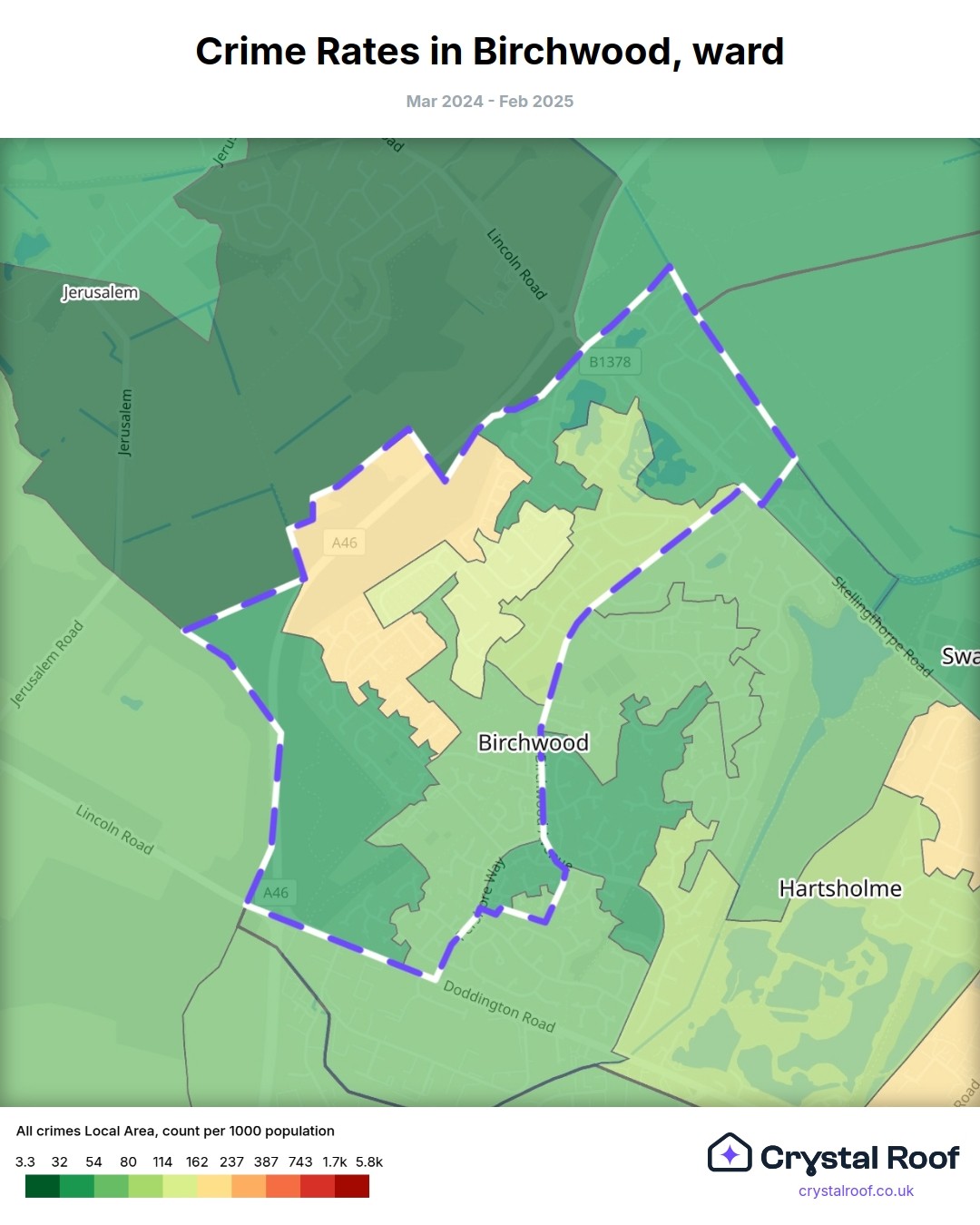 Birchwood (ward) is located within Lincoln (borough). Annual total crime rate in Lincoln (borough) is 158 crimes per thousand resident population, which can be rated as 7 out of 10 or high crime level compared to other local authority districts in England and Wales.