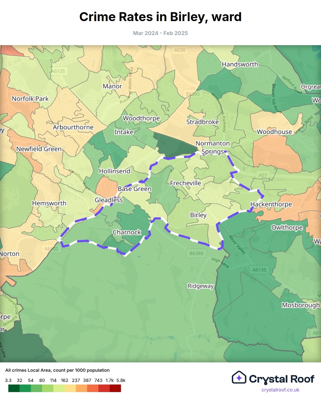 Birley, (ward) includes areas with the following crime ratings (see map):