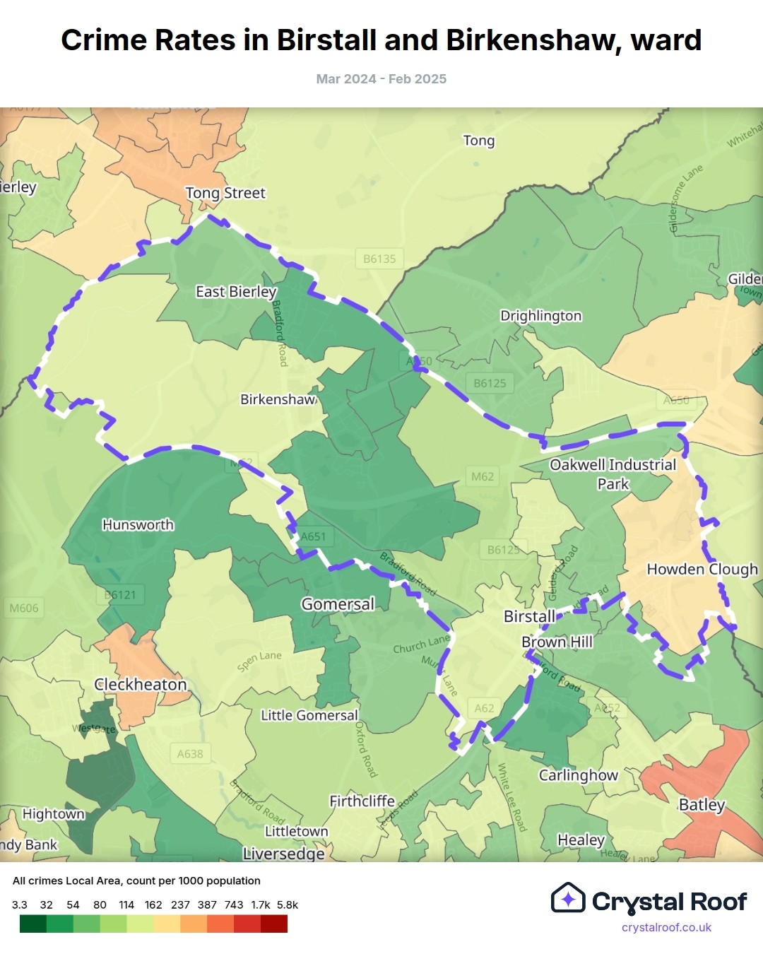 Birstall and Birkenshaw, (ward) includes areas with the following crime ratings (see map):