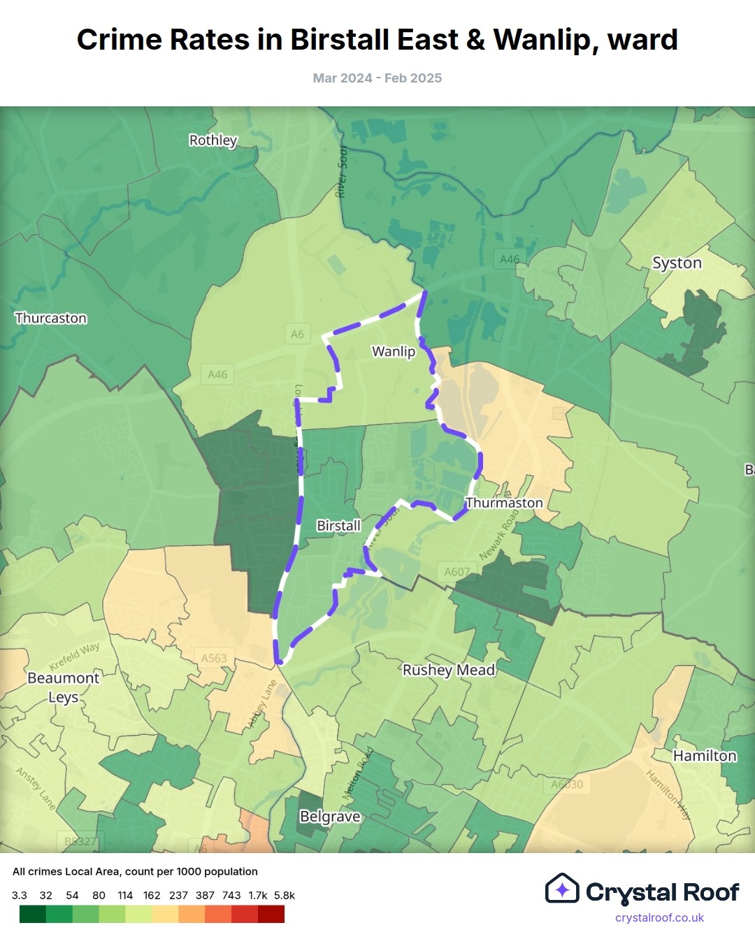 Birstall East & Wanlip, (ward) includes areas with the following crime ratings (see map):