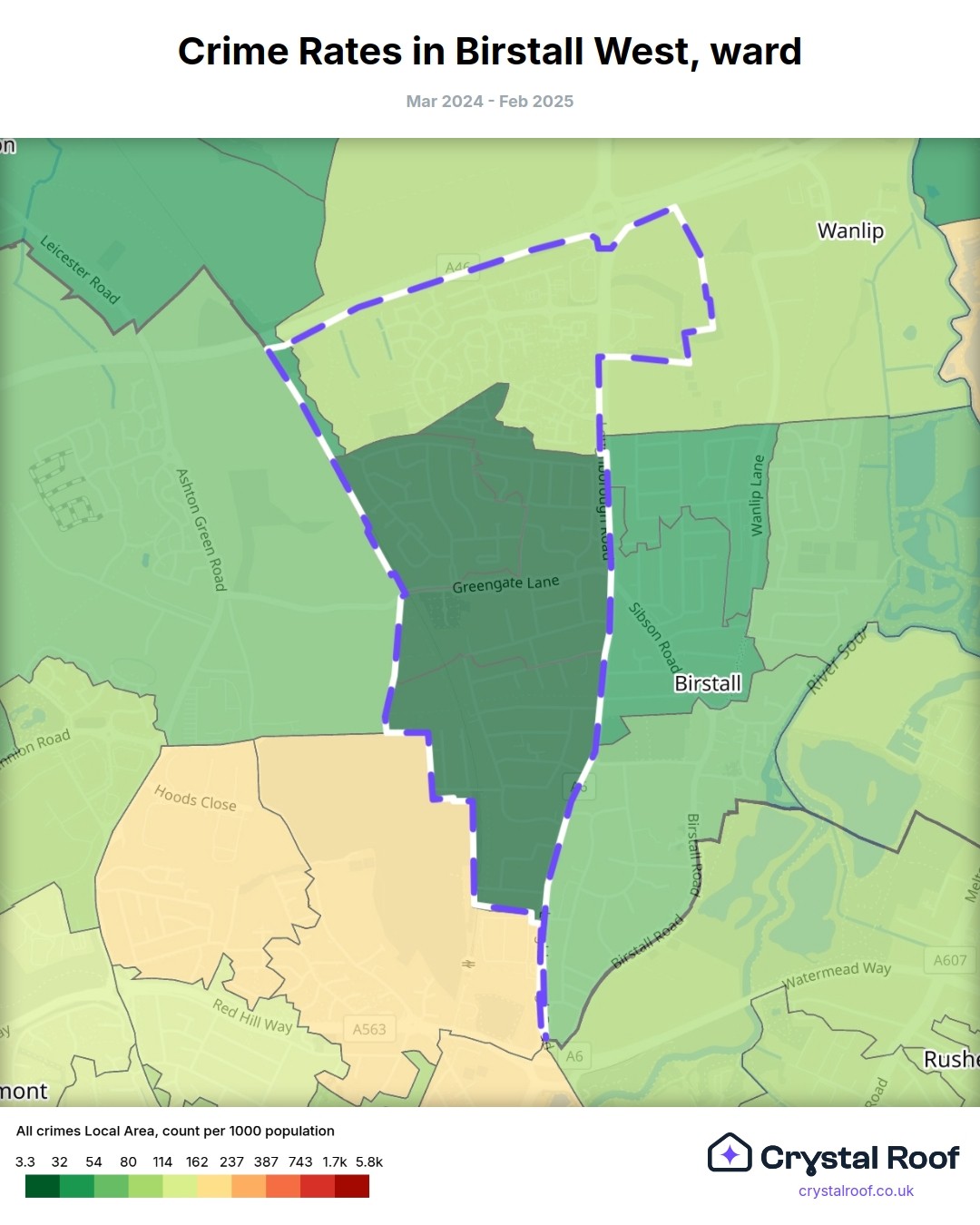 Birstall West, (ward) includes areas with the following crime ratings (see map):