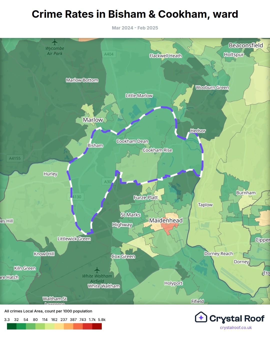 Bisham & Cookham, (ward) includes areas with the following crime ratings (see map):