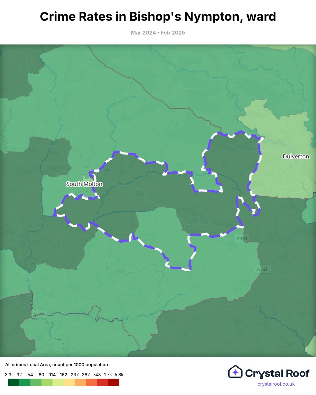 Bishop's Nympton, (ward) includes areas with the following crime ratings (see map):