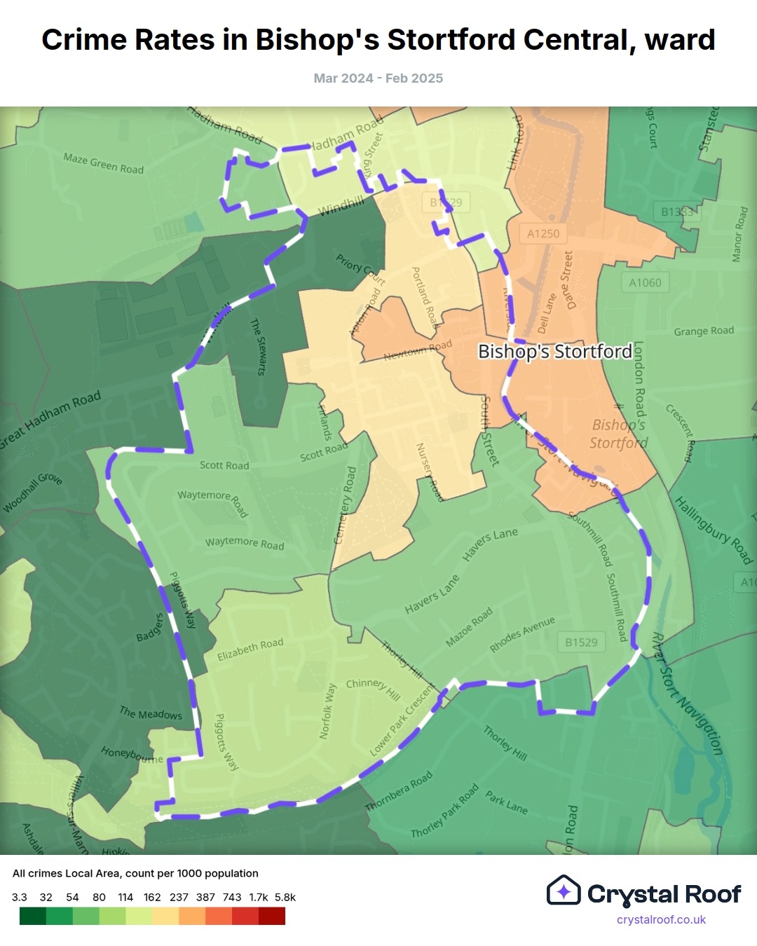Bishop's Stortford Central, (ward) includes areas with the following crime ratings (see map):