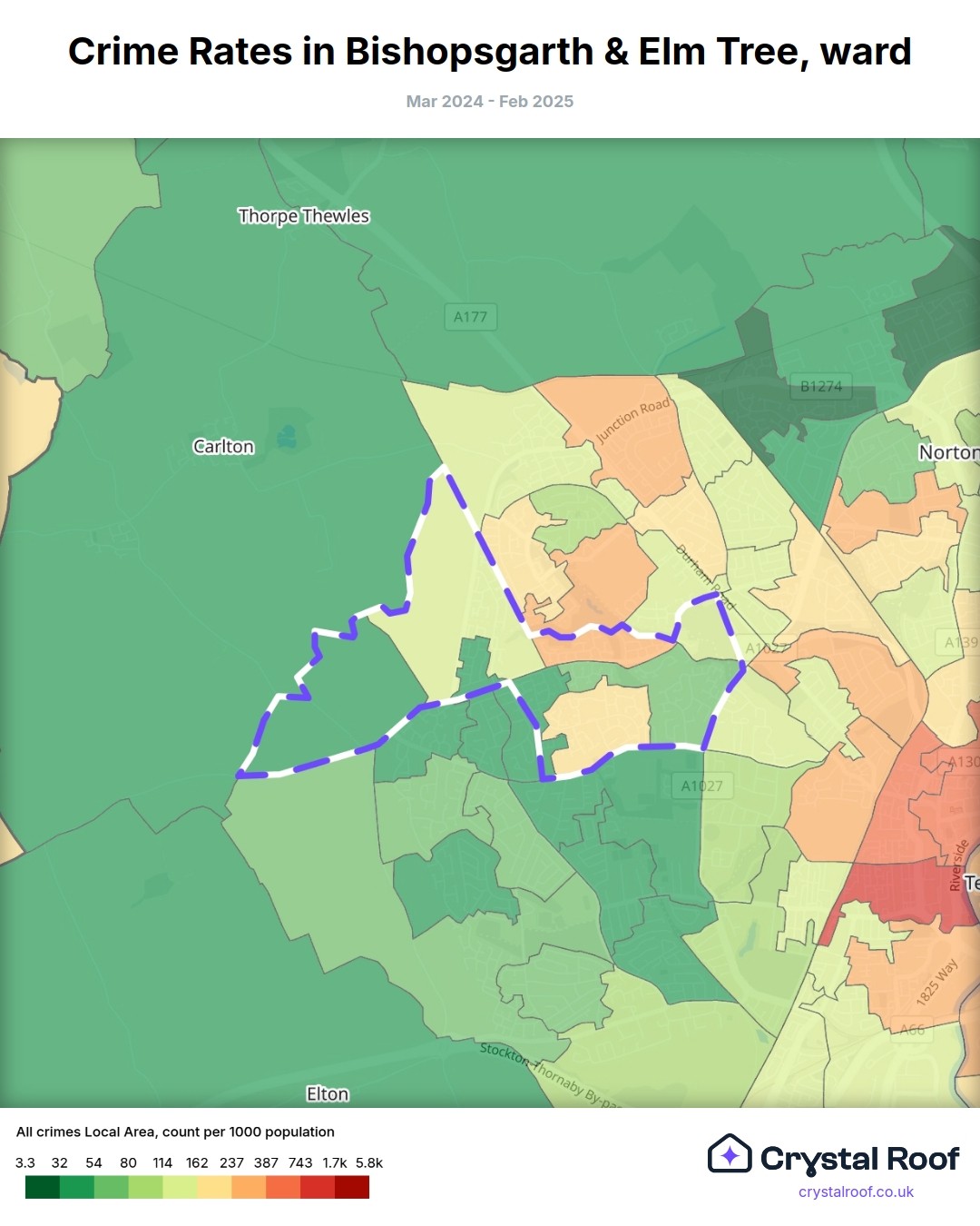 Bishopsgarth & Elm Tree, (ward) includes areas with the following crime ratings (see map):