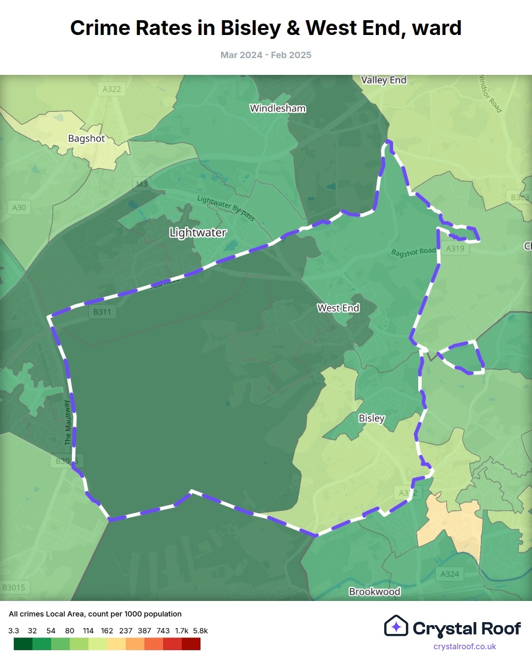 Bisley & West End, (ward) includes areas with the following crime ratings (see map):