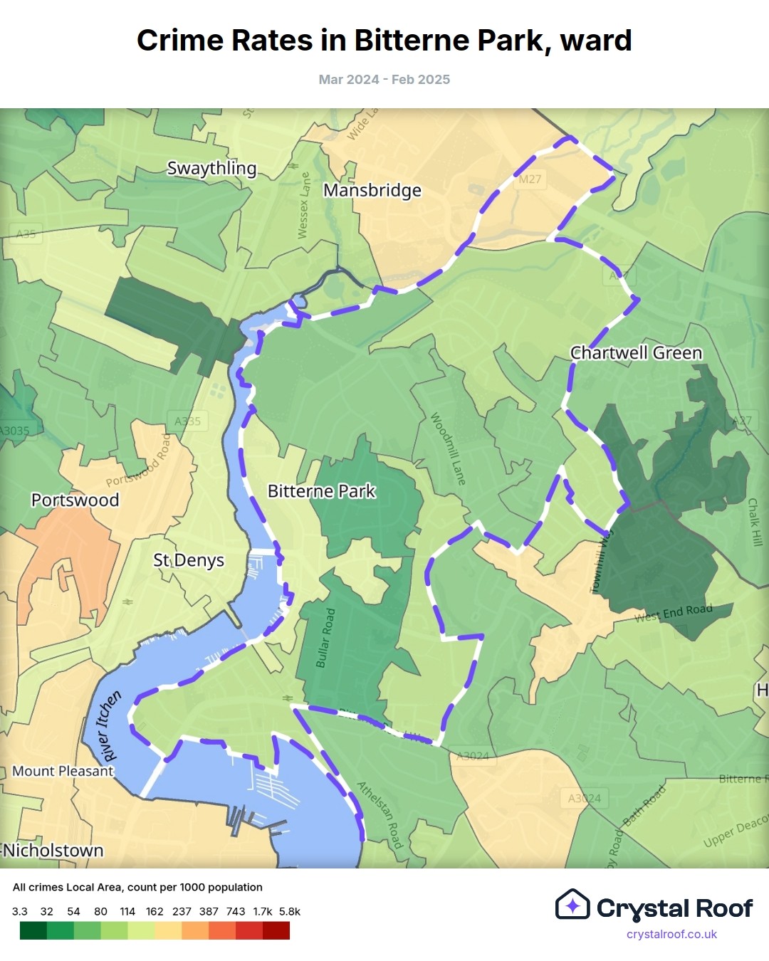Bitterne Park, (ward) includes areas with the following crime ratings (see map):