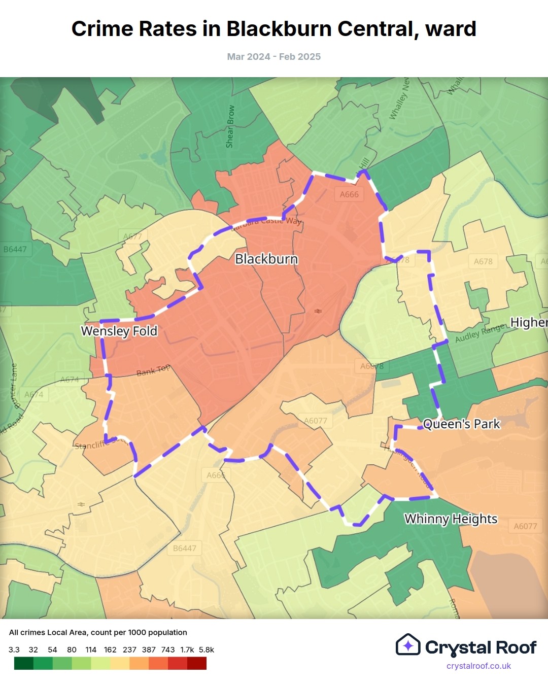 Blackburn Central, (ward) includes areas with the following crime ratings (see map):