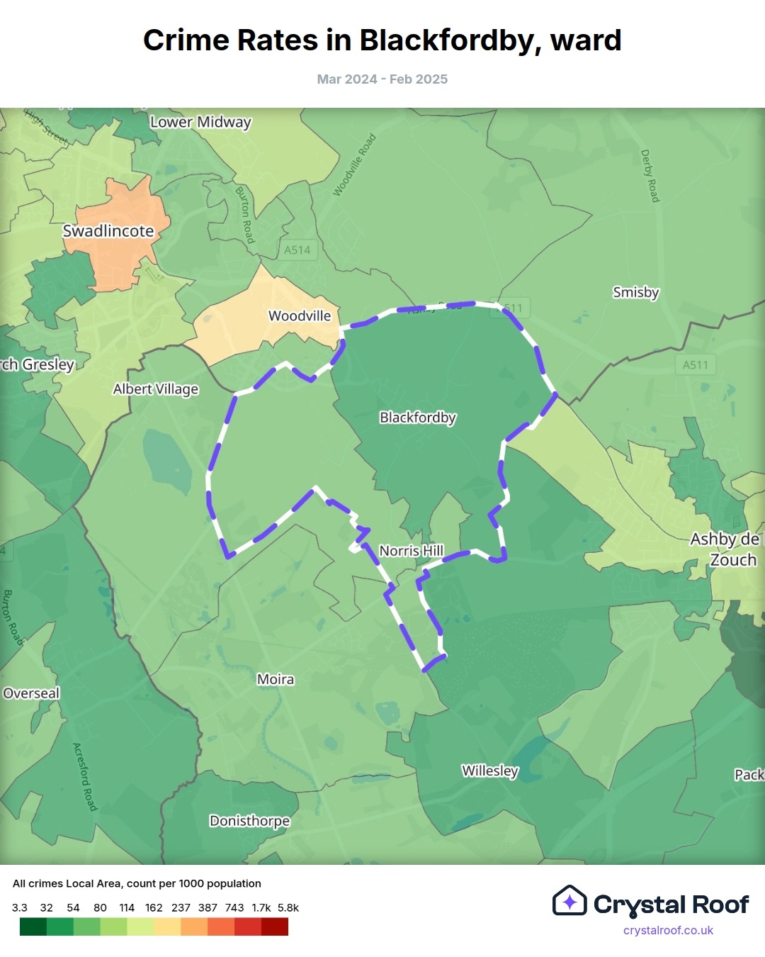 Blackfordby, (ward) includes areas with the following crime ratings (see map):