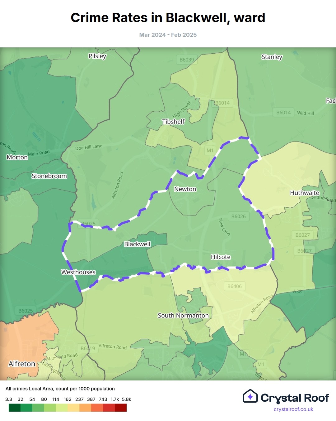 The figures in grey indicate the relative ratings of Blackwell (ward) for a specific crime type compared to other wards in England and Wales.