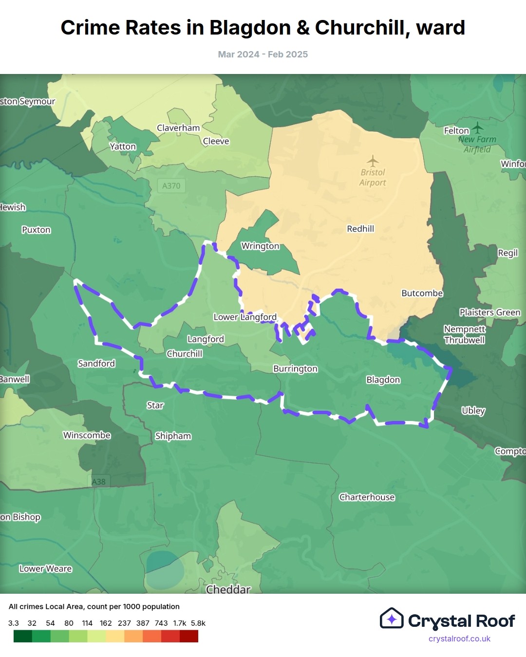Blagdon & Churchill, (ward) includes areas with the following crime ratings (see map):