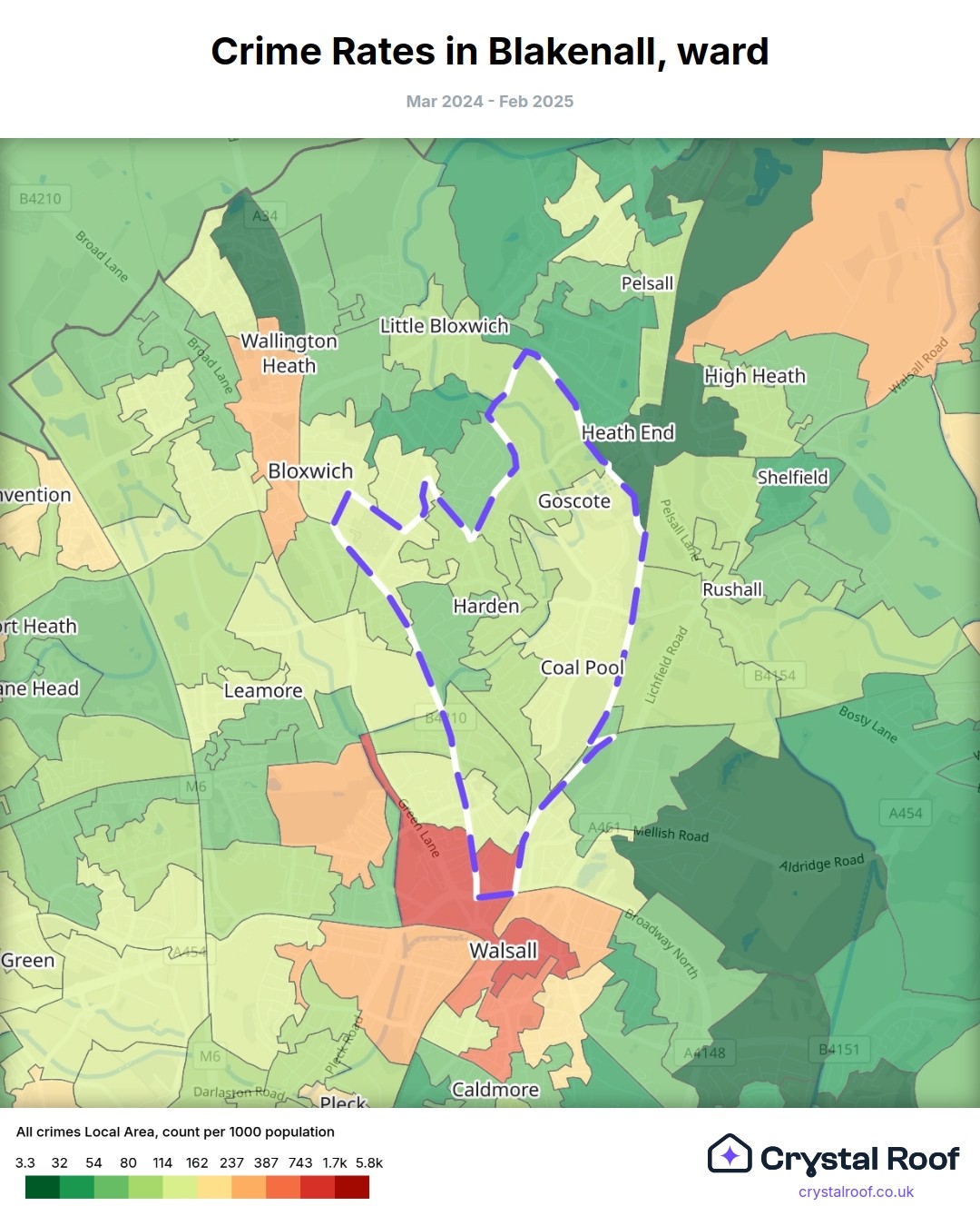 The figures in grey indicate the relative ratings of Blakenall (ward) for a specific crime type compared to other wards in England and Wales.