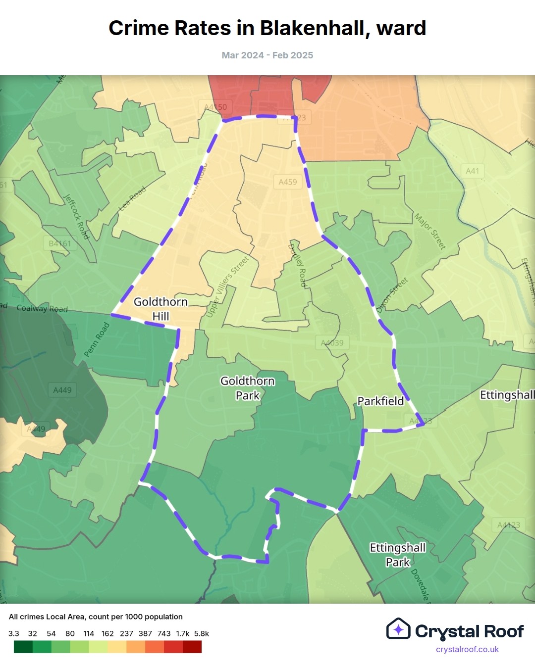 The figures in grey indicate the relative ratings of Blakenhall (ward) for a specific crime type compared to other wards in England and Wales.