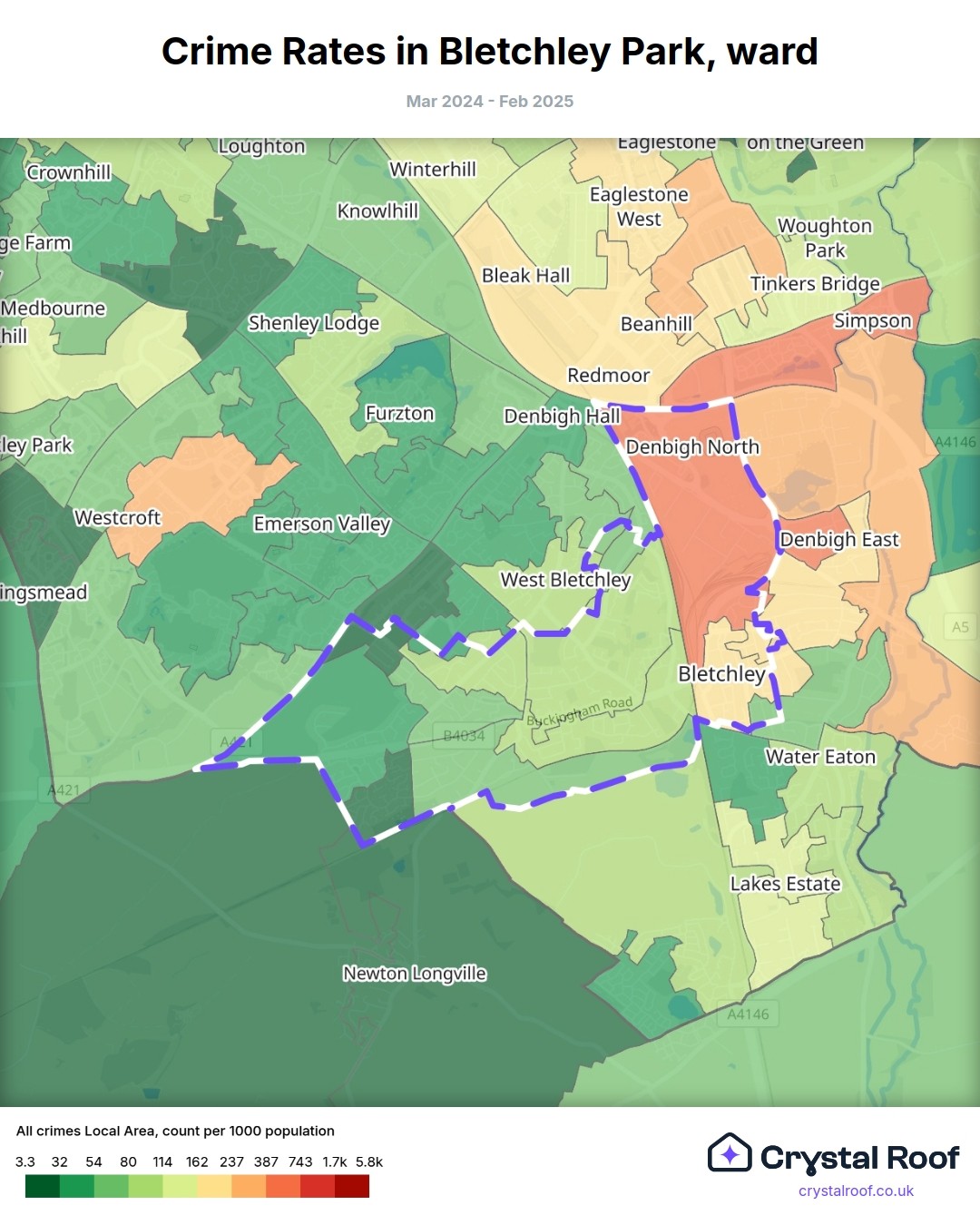 Bletchley Park, (ward) includes areas with the following crime ratings (see map):