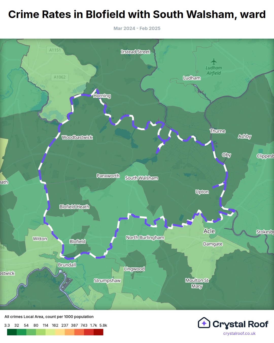 Blofield with South Walsham, (ward) includes areas with the following crime ratings (see map):