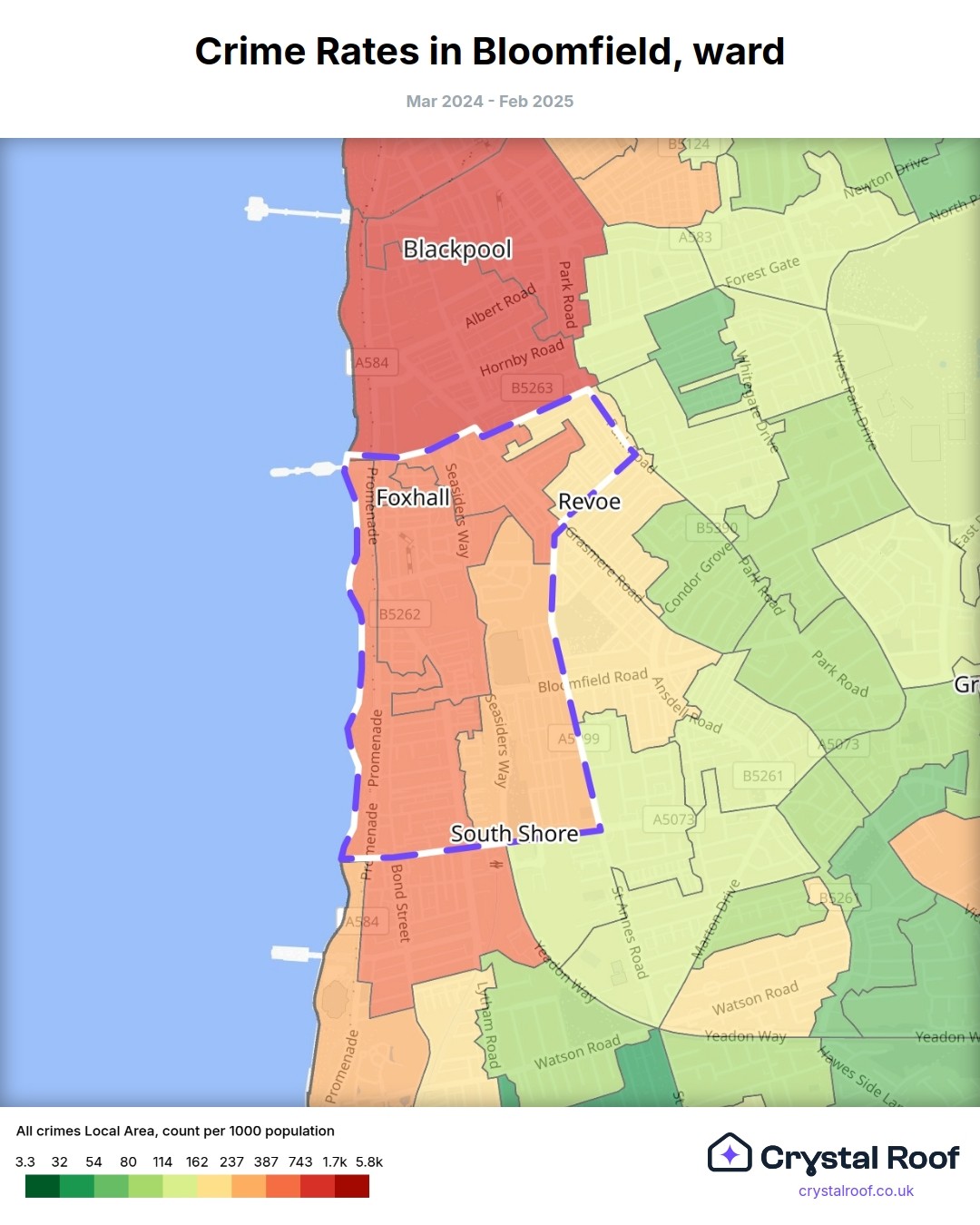 Bloomfield (ward) is located within Blackpool (borough). Annual total crime rate in Blackpool (borough) is 216 crimes per thousand resident population, which can be rated as 8 out of 10 or high crime level compared to other local authority districts in England and Wales.