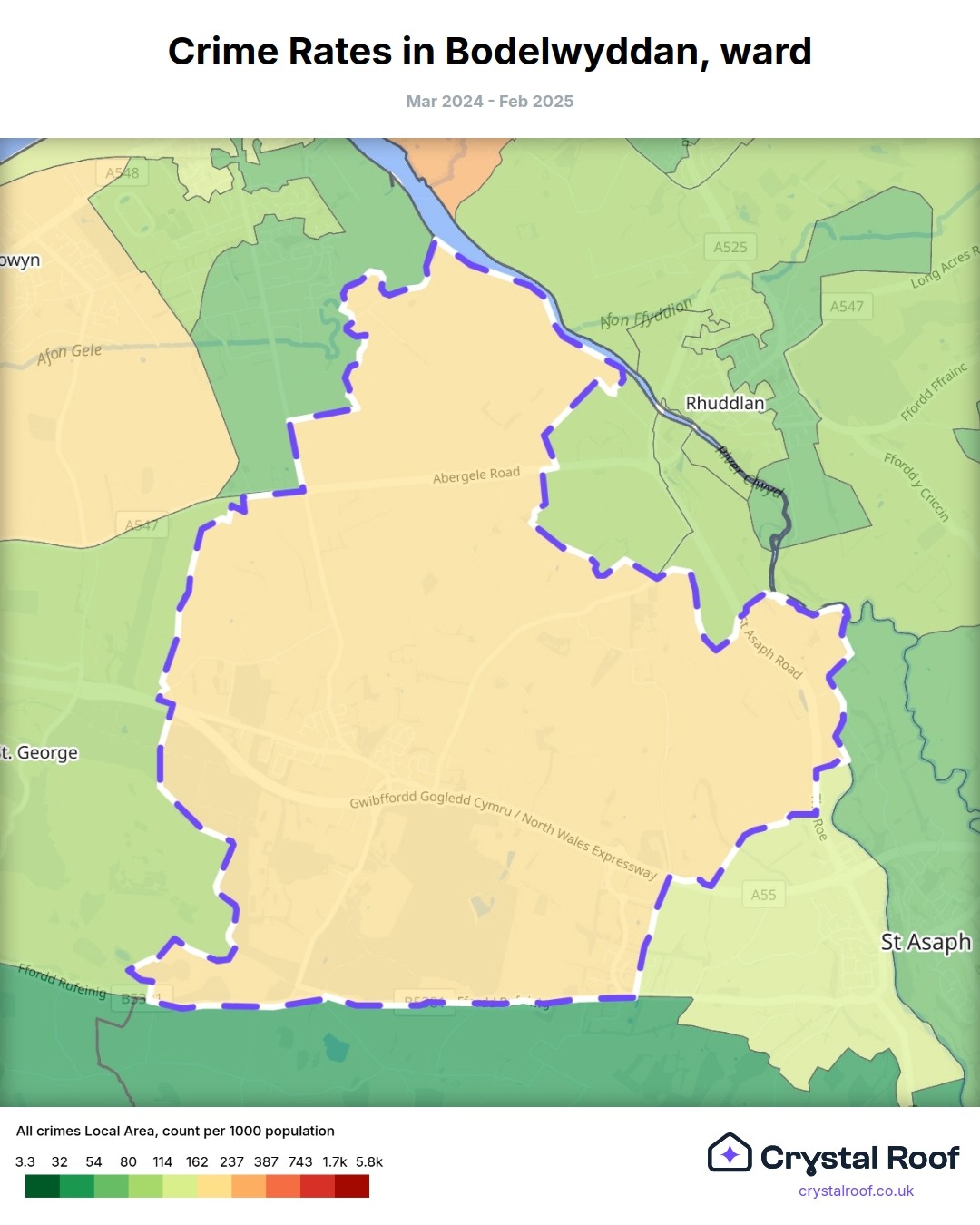 Bodelwyddan, (ward) includes areas with the following crime ratings (see map):