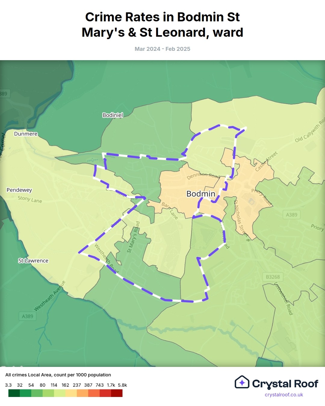 Bodmin St Mary's & St Leonard, (ward) includes areas with the following crime ratings (see map):
