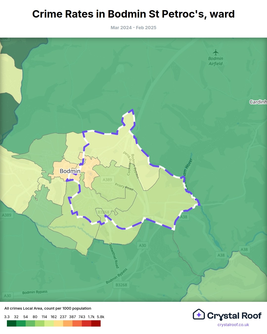 Bodmin St Petroc's, (ward) includes areas with the following crime ratings (see map):