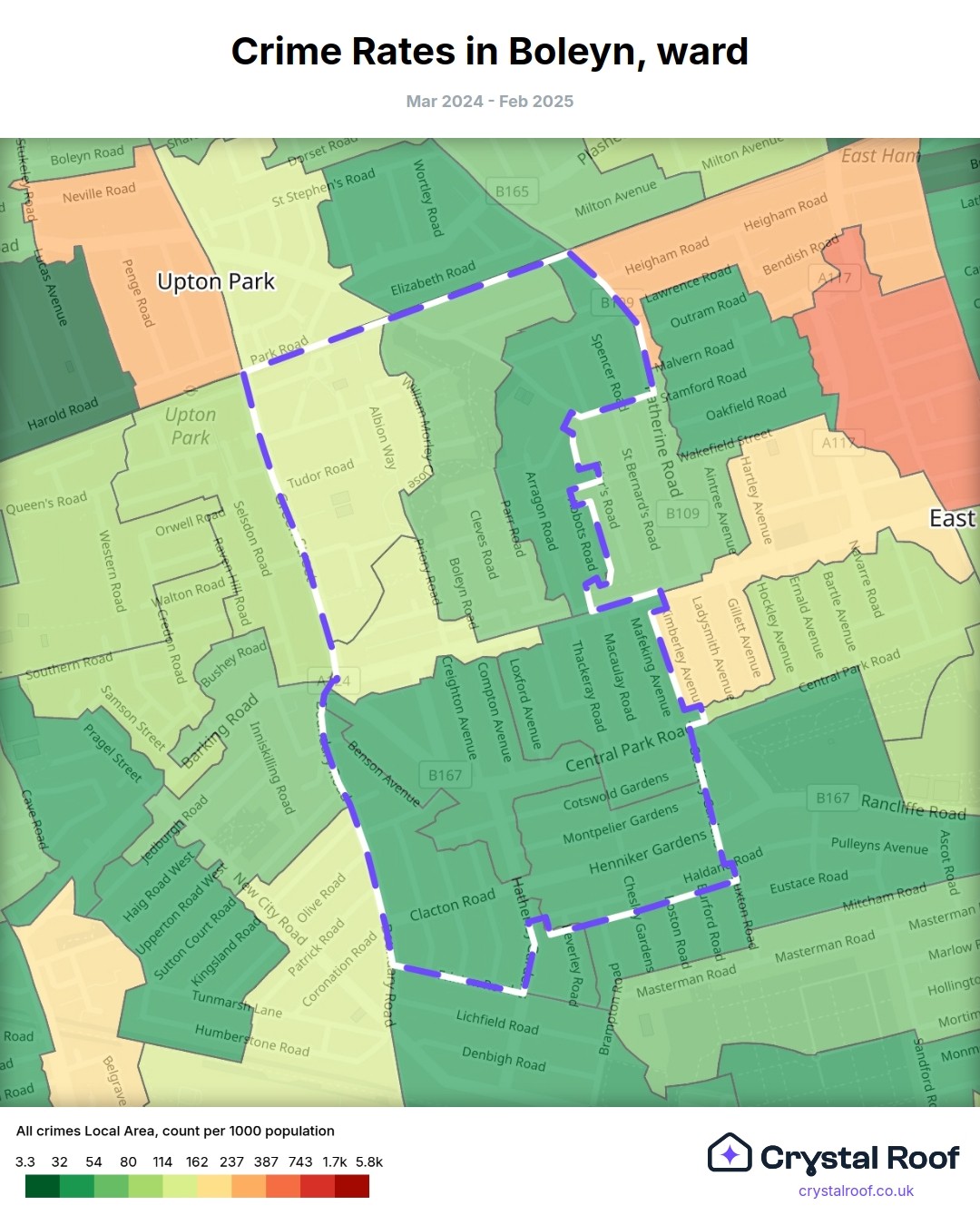 Boleyn, (ward) includes areas with the following crime ratings (see map):