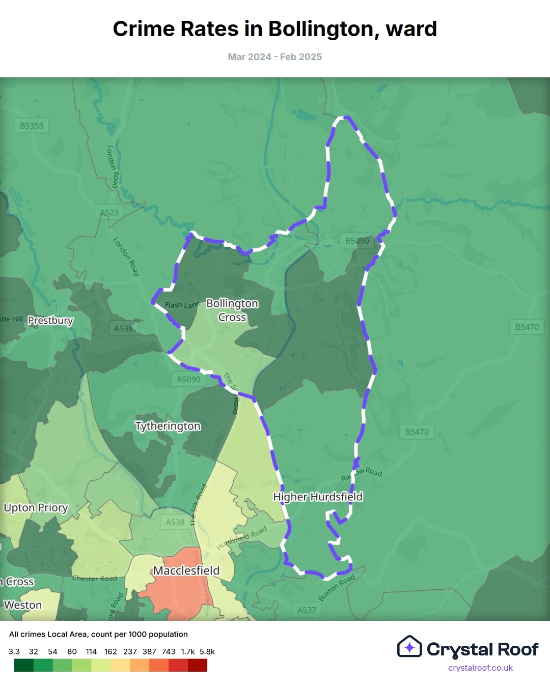 The figures in grey indicate the relative ratings of Bollington (ward) for a specific crime type compared to other wards in England and Wales.