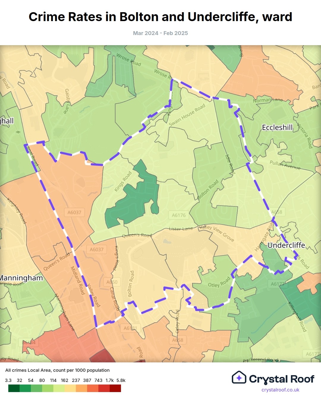 Bolton and Undercliffe, (ward) includes areas with the following crime ratings (see map):