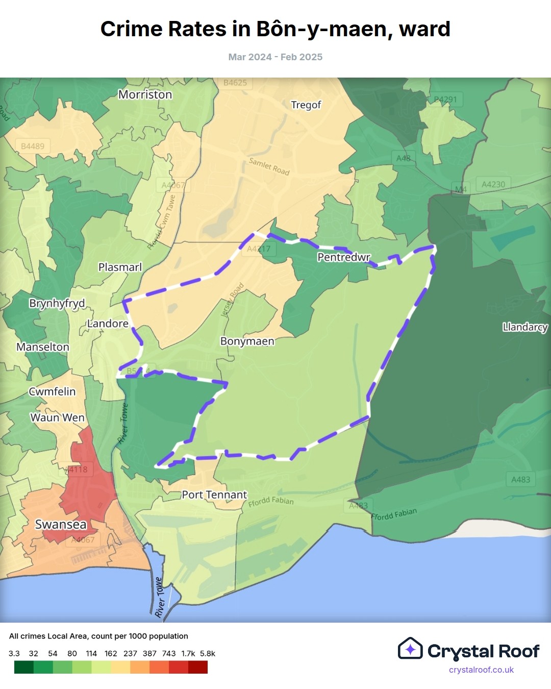 The figures in grey indicate the relative ratings of Bôn-y-maen (ward) for a specific crime type compared to other wards in England and Wales.