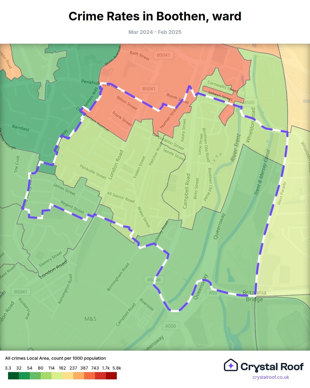 Boothen, (ward) includes areas with the following crime ratings (see map):