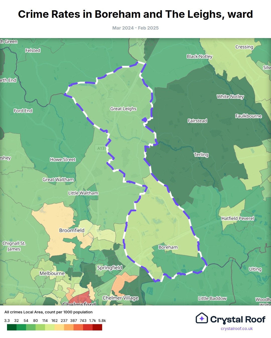 Boreham and The Leighs, (ward) includes areas with the following crime ratings (see map):