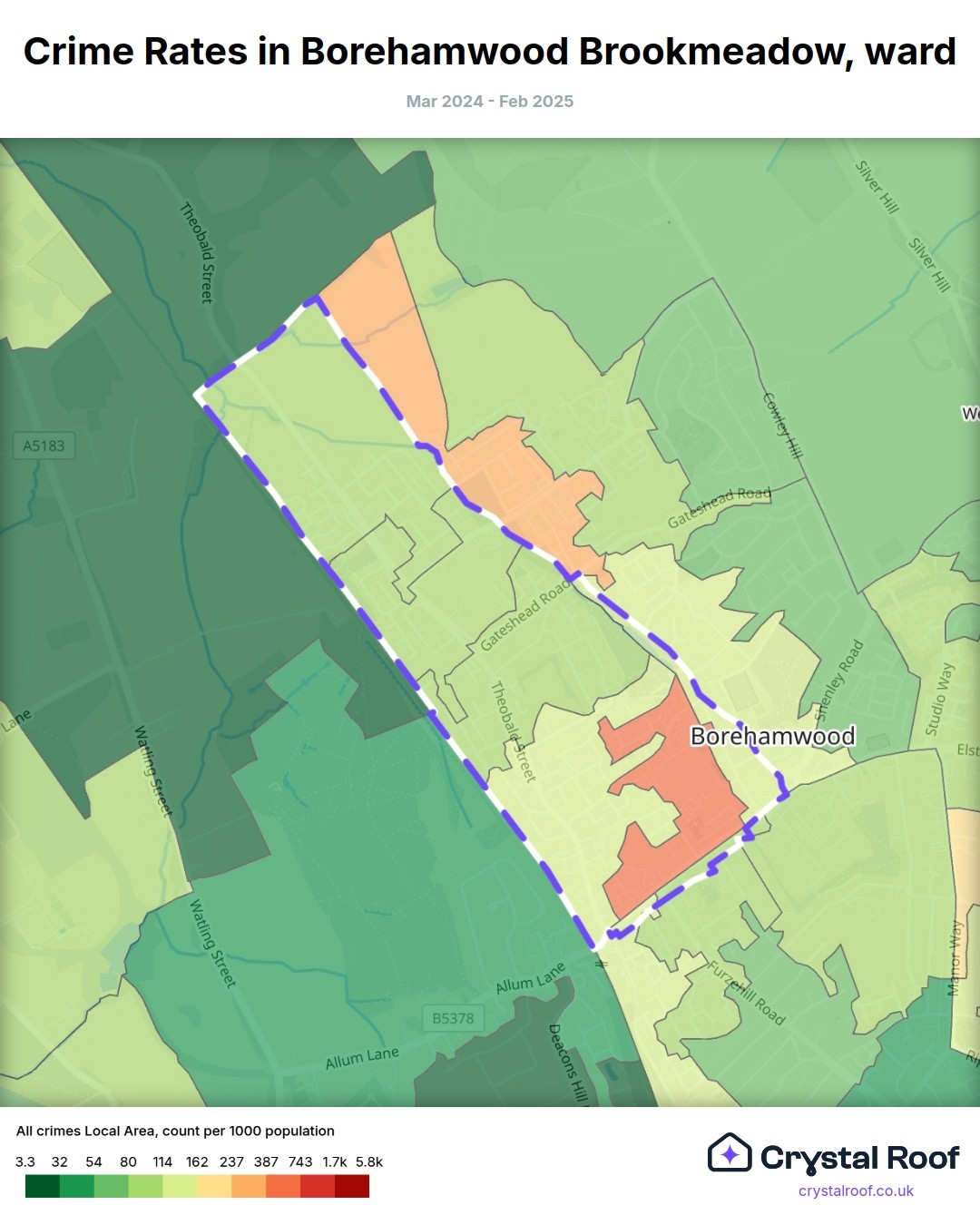Borehamwood Brookmeadow, (ward) includes areas with the following crime ratings (see map):