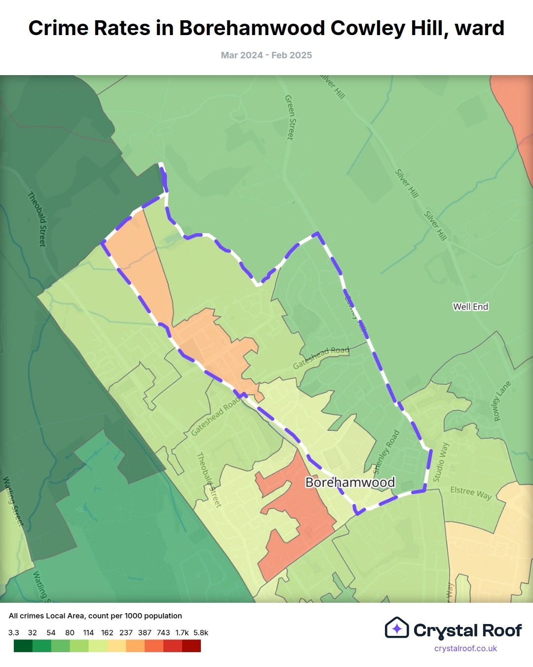 Borehamwood Cowley Hill, (ward) includes areas with the following crime ratings (see map):