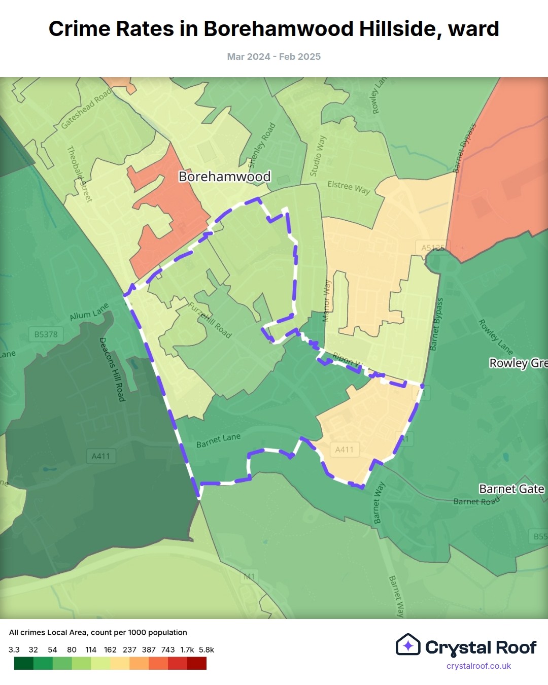 Borehamwood Hillside, (ward) includes areas with the following crime ratings (see map):