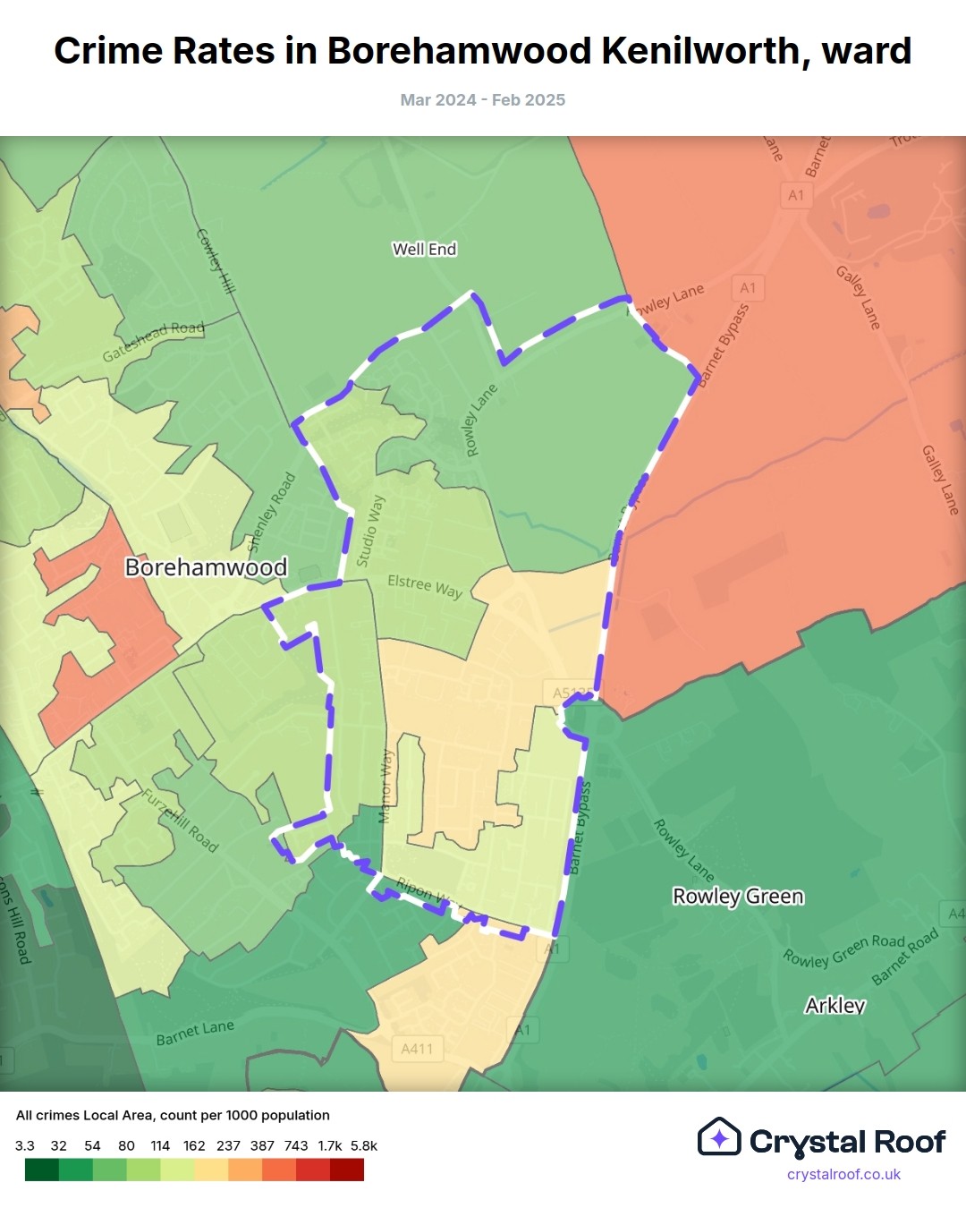 Borehamwood Kenilworth, (ward) includes areas with the following crime ratings (see map):