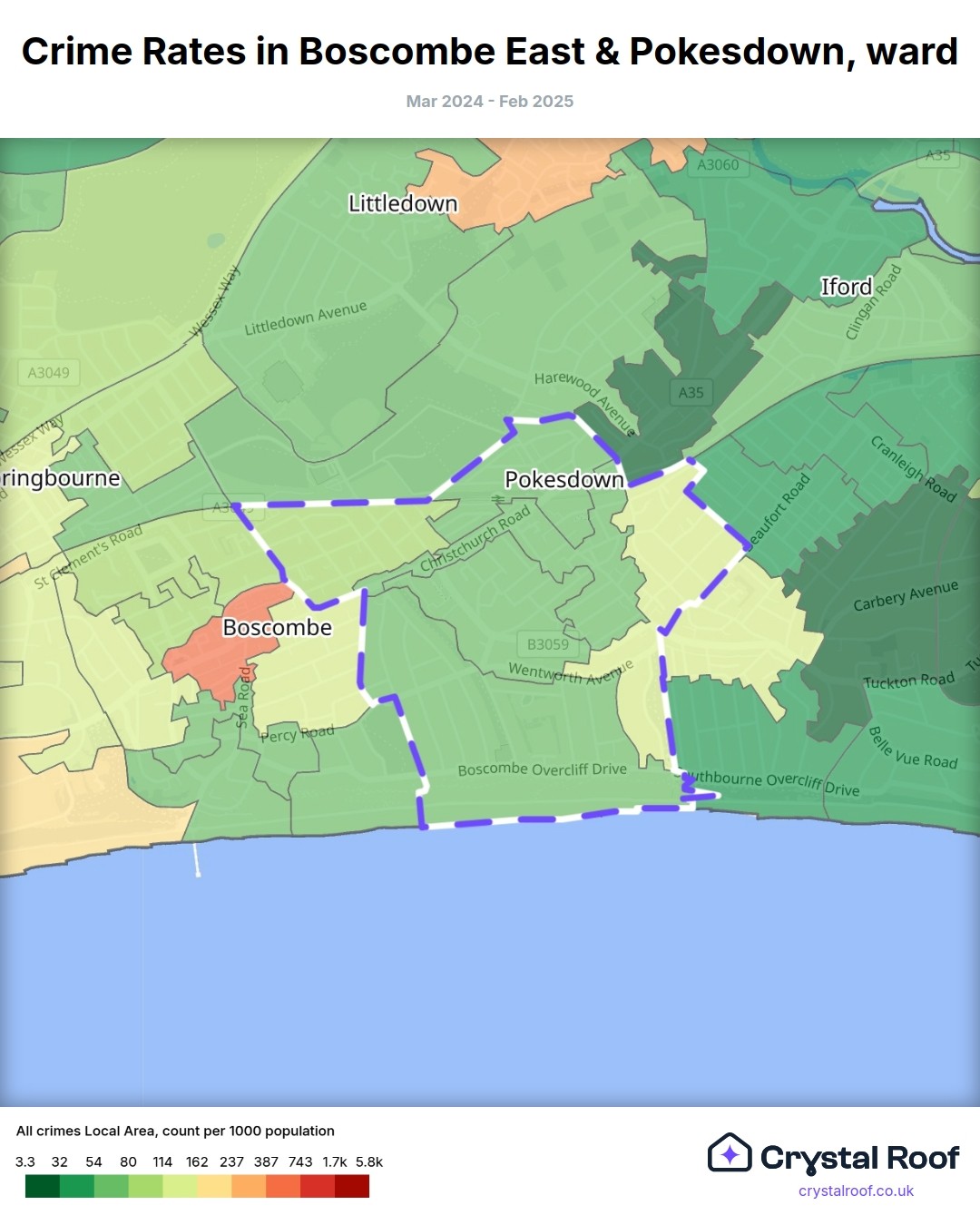 Boscombe East & Pokesdown, (ward) includes areas with the following crime ratings (see map):