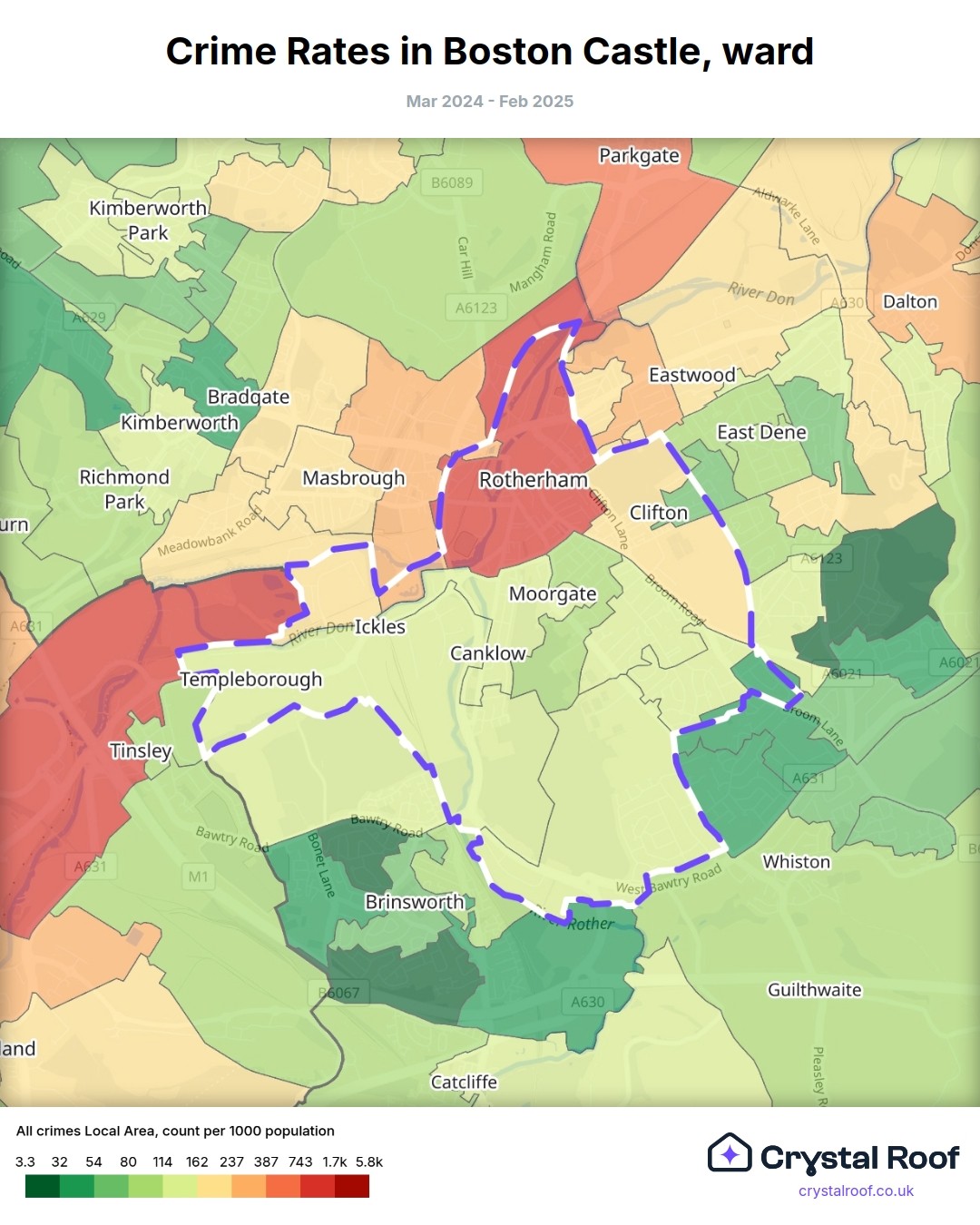 Boston Castle, (ward) includes areas with the following crime ratings (see map):