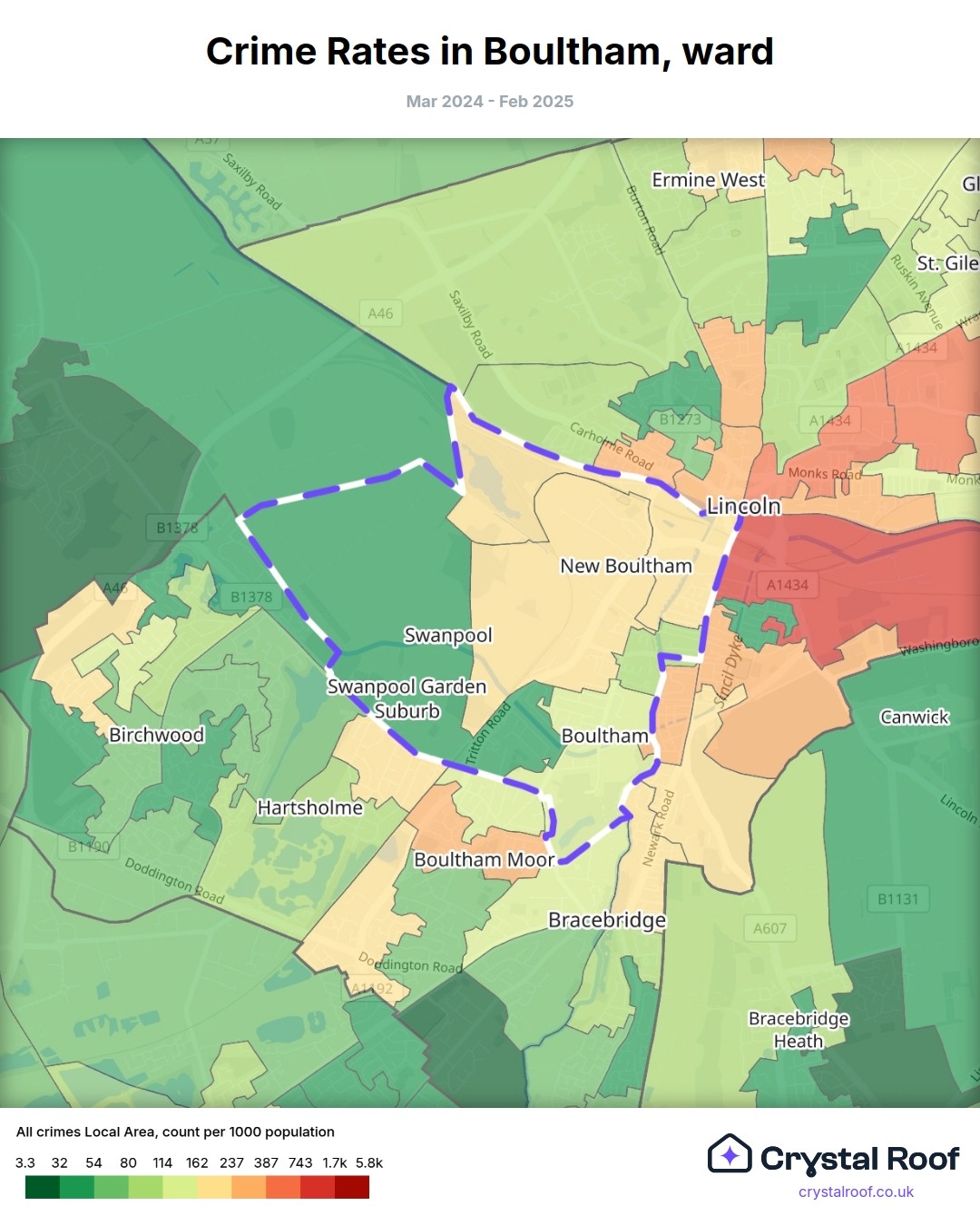 Boultham (ward) is located within Lincoln (borough). Annual total crime rate in Lincoln (borough) is 158 crimes per thousand resident population, which can be rated as 7 out of 10 or high crime level compared to other local authority districts in England and Wales.