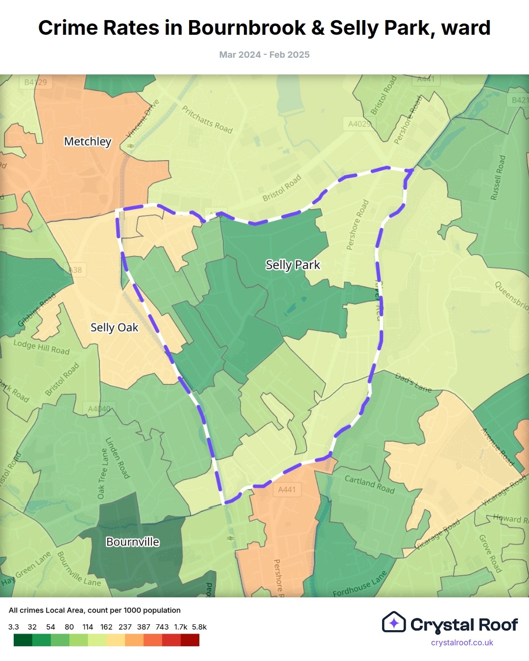 Bournbrook & Selly Park, (ward) includes areas with the following crime ratings (see map):