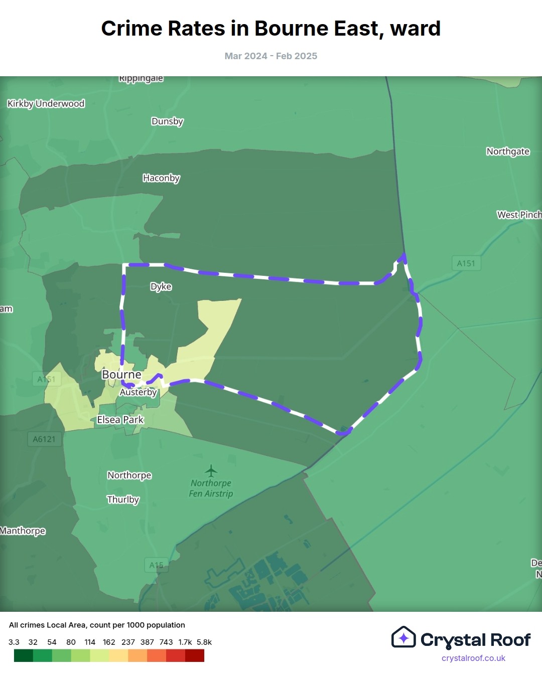 Bourne East (ward) is located within South Kesteven (borough). Annual total crime rate in South Kesteven (borough) is 70.9 crimes per thousand resident population, which can be rated as 2 out of 10 or low crime level compared to other local authority districts in England and Wales.